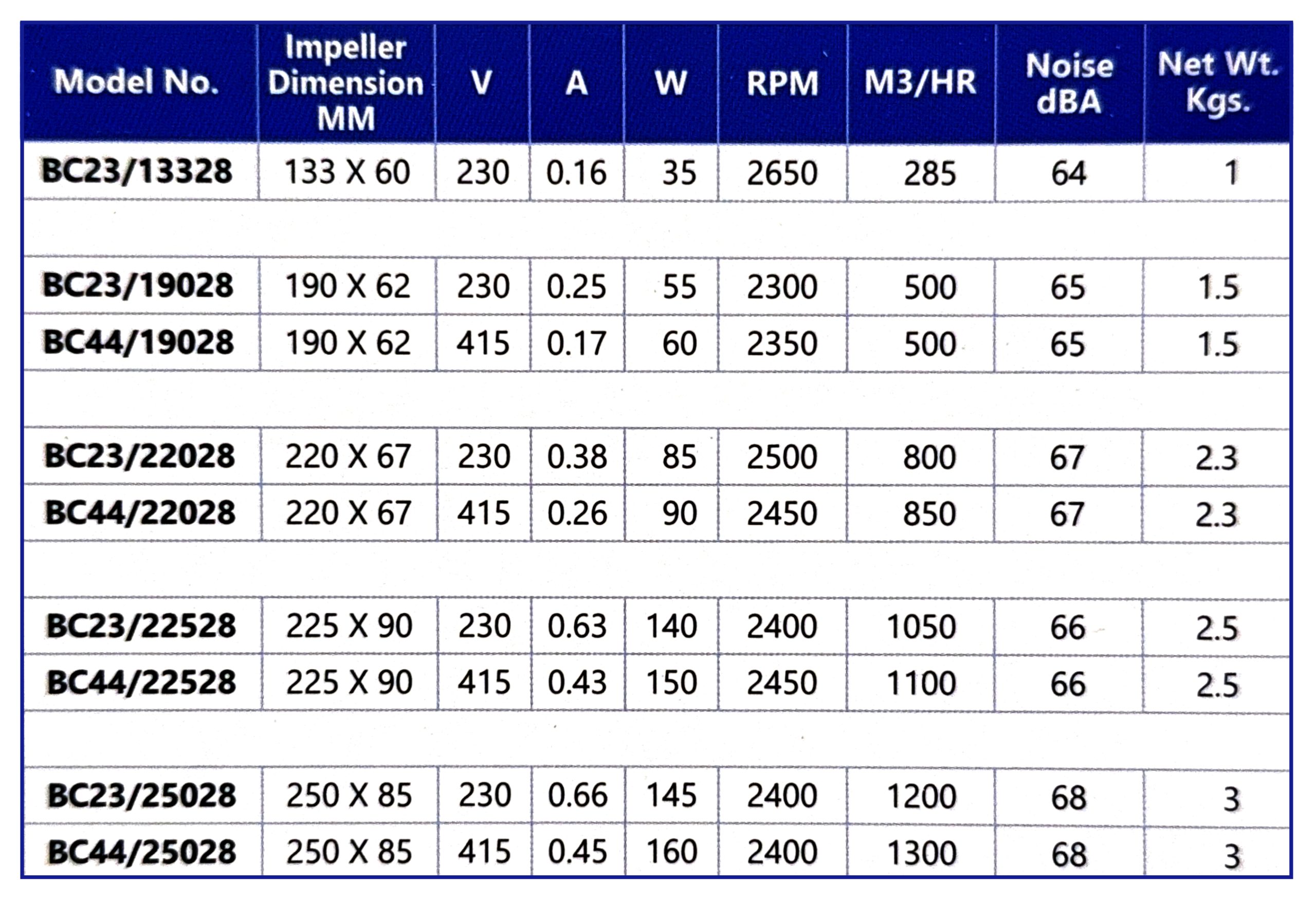 | Model No. | Impeller Dimension (MM) | V | A | W | RPM | M³/HR | Noise (dBA) | Net Wt. (Kgs) |